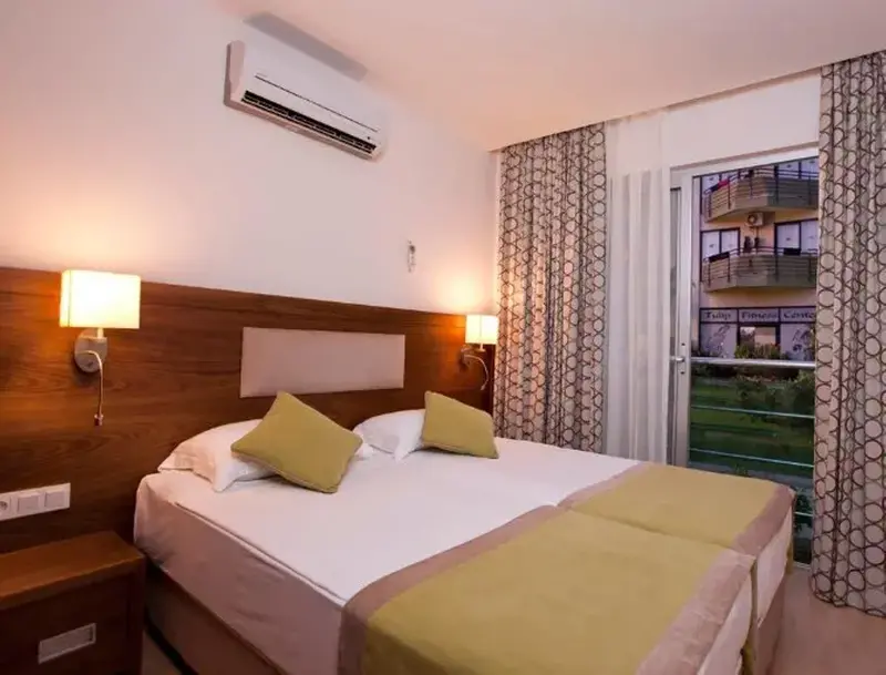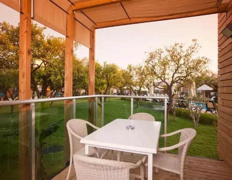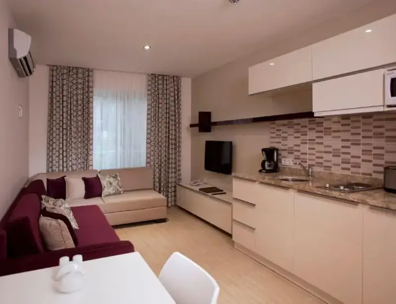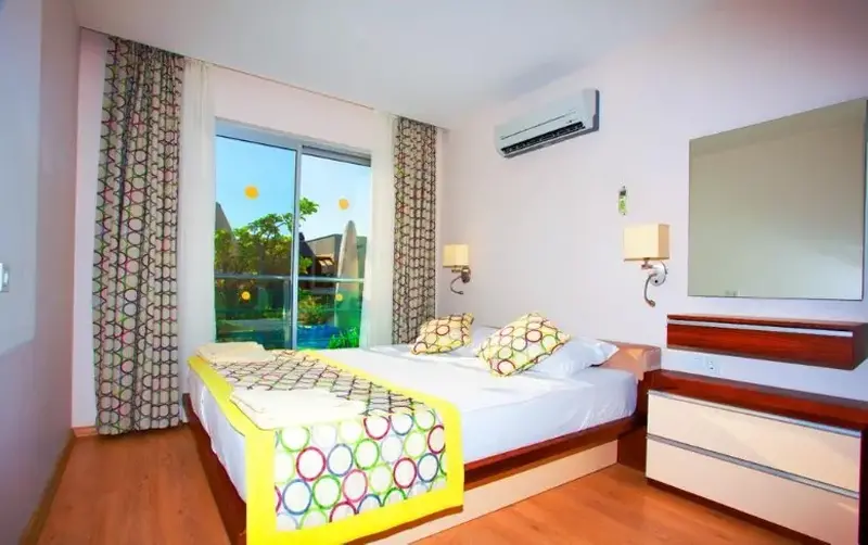 Our rooms are 50 m² and feature a 10 m² veranda, featuring comfortable single and double beds, a safe, kettle, telephone, tea and coffee maker, smart TV (for using YouTube apps, etc.), hair dryer, make-up mirror, air conditioning in all rooms, kitchen, kitchenware, seating area, shower, WC, refrigerator, shampoo, shower gel, and conditioner. The kitchen has stylish ceramic floors, and the bedrooms have laminate flooring. One of the features that distinguishes our villas from other rooms is their access to a shared pool, separate from the hotel and other villas. Wi-Fi is available free of charge in the rooms and common areas. You can also use our Wi-Fi interface on your smart phone to contact a guest representative regarding all your requests and requests, or have your orders delivered to your room directly from your phone. Room Features PATIO WI-FI SAFETY SAFE KITCHEN KITCHEN EQUIPMENT TOASTER MICROWAVE REFRIGERATOR KETTLE TEA AND COFFEE MAKER PHONE AIR CONDITIONING LED SMART TV (YOUTUBE, BROWSER) SHOWER VANITY MIRROR HAIR DRYER SEATING GROUP 24-HOUR ROOM SERVICE TURNDOWN SERVICE (EXTRA)